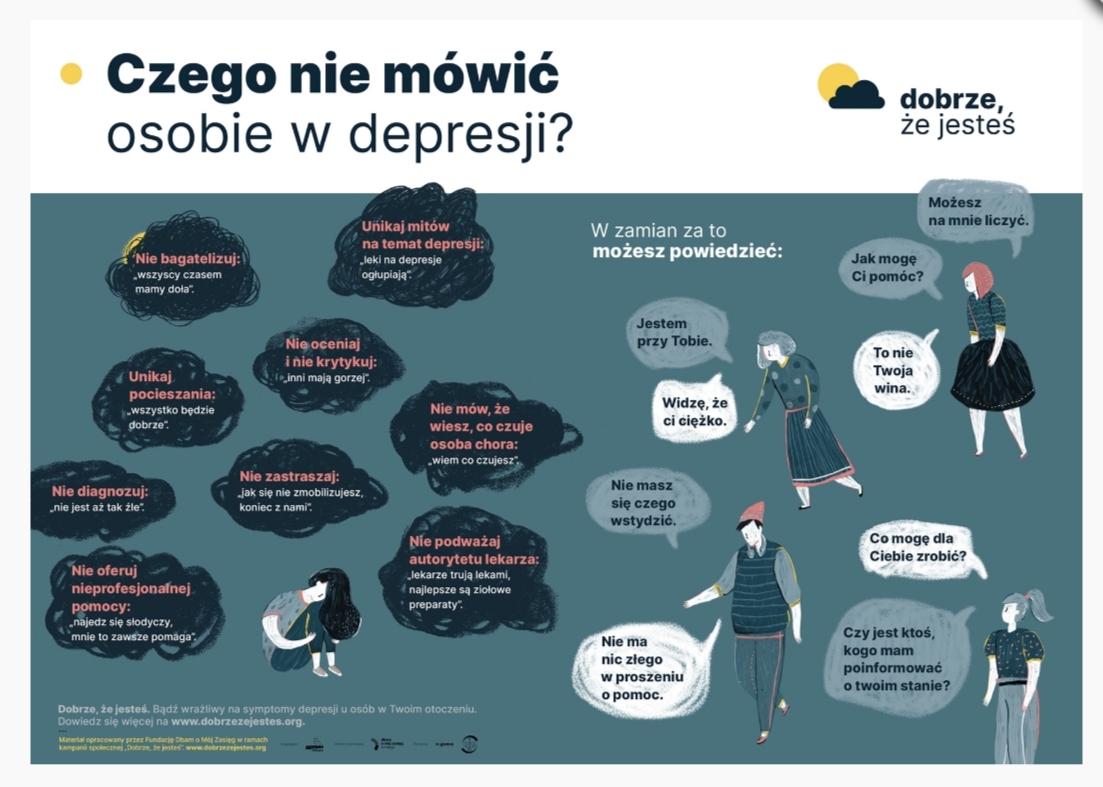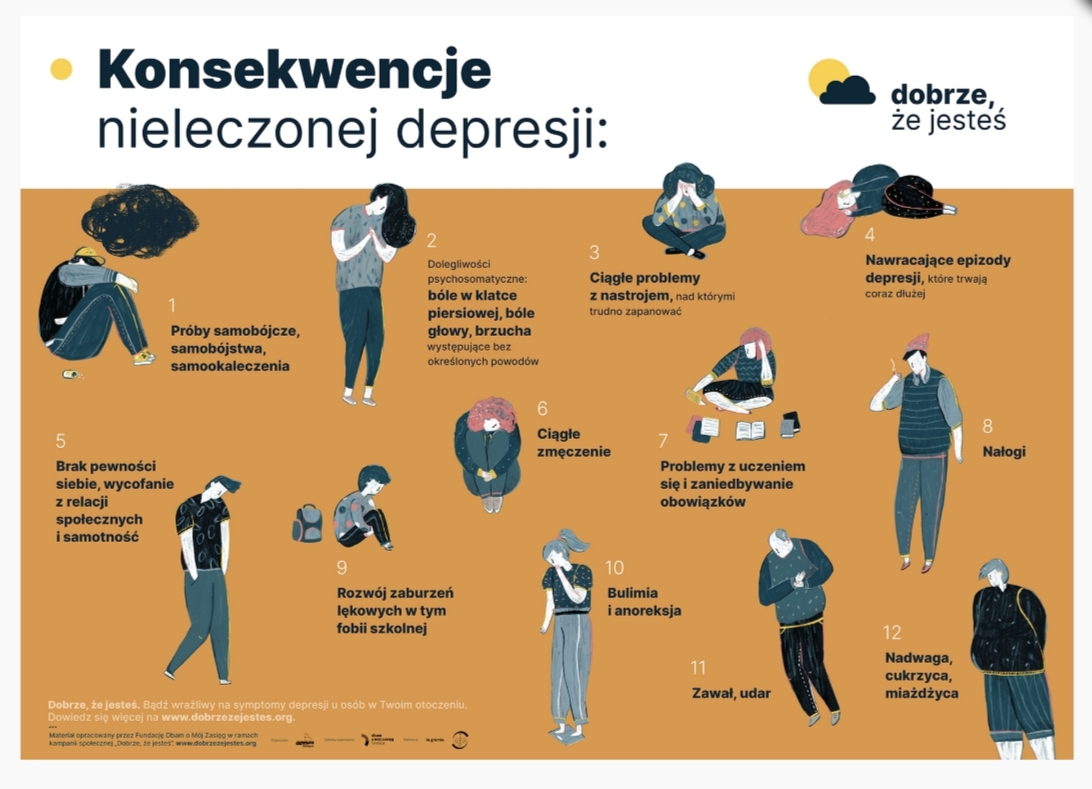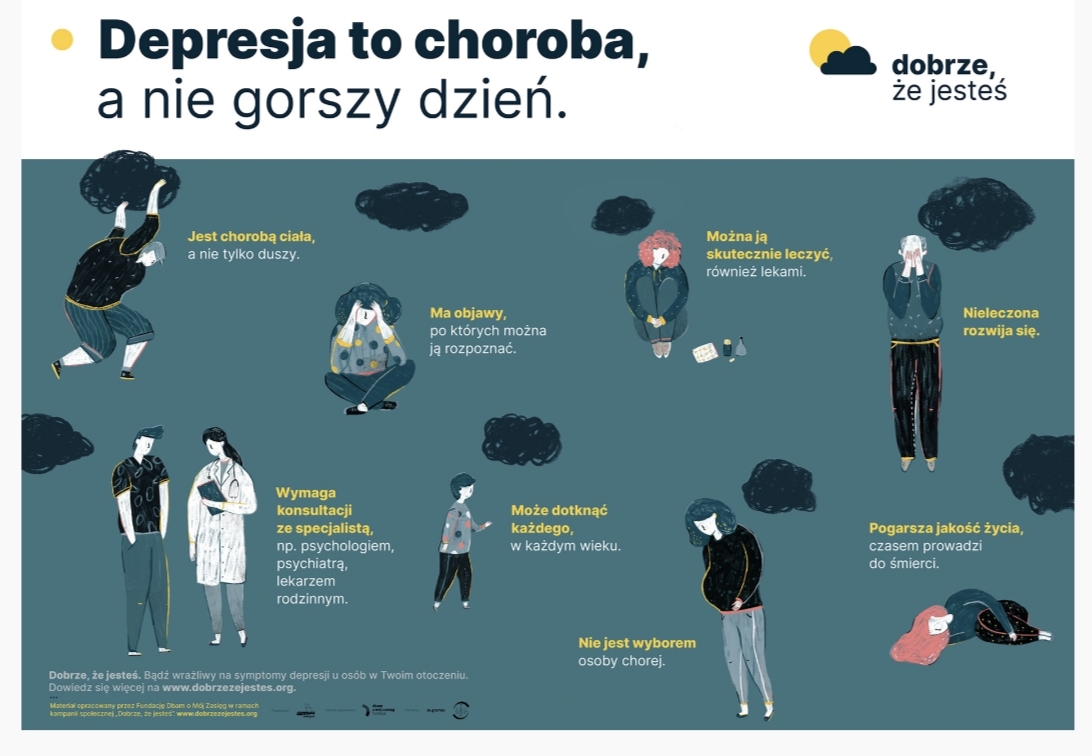 Depresja nie jest „złym humorem”, „lenistwem” ani „buntem”. To realne cierpienie, które wpływa na emocje, myślenie, relacje i codzienne funkcjonowanie. Jeśli podejrzewasz u siebie lub u bliskiej ci osoby depresję powiedz to wychowawcy lub jednemu ze specjalistów pracujących w szkole. Poniżej link do testu skali depresji Kutchera dla młodzieży