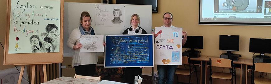 W dniu 28 kwietnia 2023r. nastąpiło uroczyste podsumowanie projektu „Książka jest lekarstwem na letarg” i konkursu „Uwolnij literacką wyobraźnię” w ramach Narodowego Programu Rozwoju Czytelnictwa. Nagrodzeni otrzymali dyplomy i nagrody rzeczowe, które zostały im wręczone przez Dyrekcję Szkoły. Zgromadzeni uczniowie mieli okazję podziwiać prace plastyczne laureatów, które ozdobiły czytelnię szkoły.