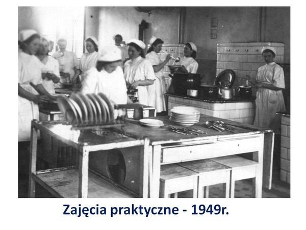 Na początku brakowało nauczycieli, nie było także warsztatu do prowadzenia zajęć praktycznych. Poza dyrektorką szkoły, z młodzieżą pracowała tylko wychowawczyni, pani Krystyna Wróblowa. Jak można przeczytać w najstarszej kronice szkolnej, dziewczęta przyrządzały posiłki w „baraku zawalonym gruzem, gdzie sterczały cztery rzędem postawione piece”. Pierwszej przygotowanej przez uczennice potrawie, a były nią gołąbki, zagrażały spadające z sufitu kawałki cegieł i wapiennego tynku.