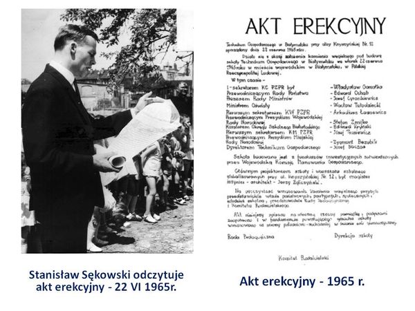 Rok 1965 przyniósł ważną wiadomość. Przy ulicy Knyszyńskiej 4/10 wmurowany został akt erekcyjny pod budowę nowego gmachu szkolnego i warsztatów. W towarzystwie wysoko postawionych osobistości akt odczytał nauczyciel języka polskiego, Stanisław Sękowski, a wmurował go w ścianę sali gimnastycznej od strony południowo-zachodniej zastępca przewodniczącego Prezydium Wojewódzkiej Rady Narodowej – inż. Jerzy Zientara. Koszt budowy obliczono na 17,5 miliona złotych. Głównym projektantem szkoły i warsztatu szkolnego był architekt Jerzy Zgliczyński.