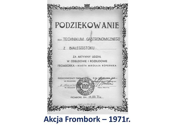 W roku 1973 cały kraj żył 500 rocznicą urodzin Mikołaja Kopernika. Instytucje kulturalne, stowarzyszenia i szkoły organizowały liczne sesje popularnonaukowe, wieczornice i prezentowały wykłady upowszechniające wiedzę o losach i działalności wielkiego astronoma. Jedną z sesji przygotowała grupa młodzieży ze szkoły gastronomicznej pod kierunkiem nauczyciela matematyki, Eugeniusza Łowickiego. Wygłoszono sześć referatów, wyświetlony został film zrealizowany przez uczniów w czasie wędrówek szlakami Kopernika oraz nastąpiło uroczyste podsumowanie efektów kilkuletniego udziału harcerzy z Zespołu Szkół Gastronomicznych w ogólnopolskiej akcji „Frombork 1001”. Za zasługi dla tego miasta szkoła otrzymała tytuł Honorowego Obywatela Fromborka.