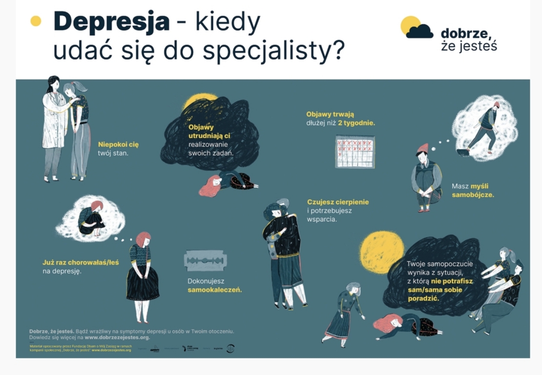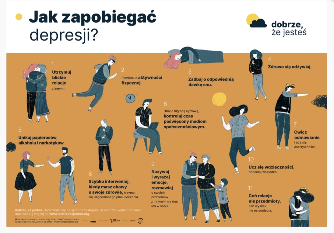 Depresja nie jest „złym humorem”, „lenistwem” ani „buntem”. To realne cierpienie, które wpływa na emocje, myślenie, relacje i codzienne funkcjonowanie. Jeśli podejrzewasz u siebie lub u bliskiej ci osoby depresję powiedz to wychowawcy lub jednemu ze specjalistów pracujących w szkole. Poniżej link do testu skali depresji Kutchera dla młodzieży