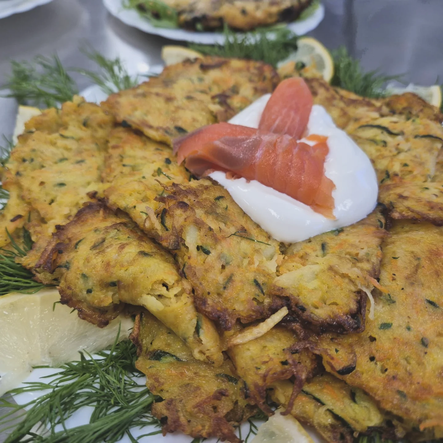 Placki ziemniaczane z cukinią i marchewką, podane ze śmietaną i wędzonym łososiem