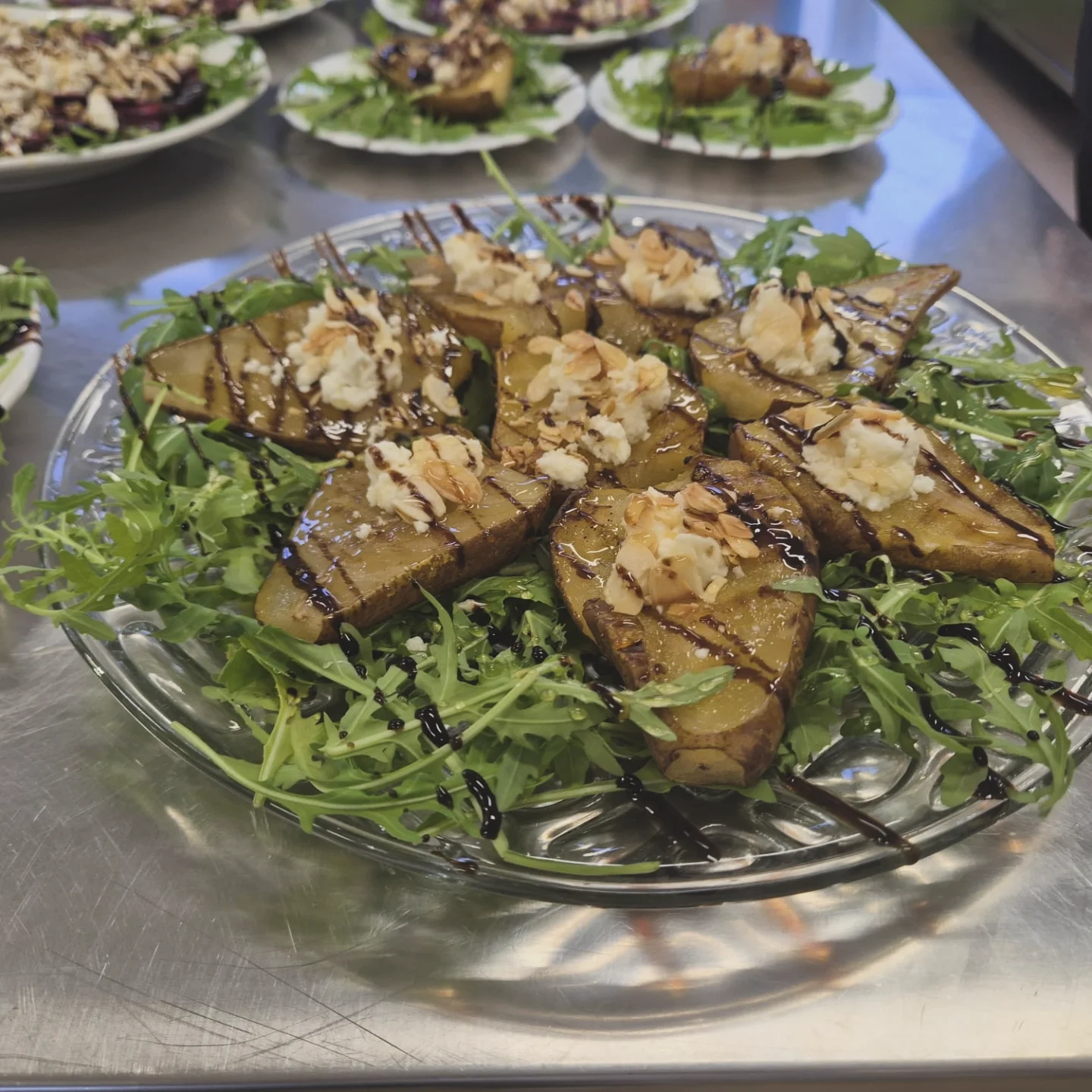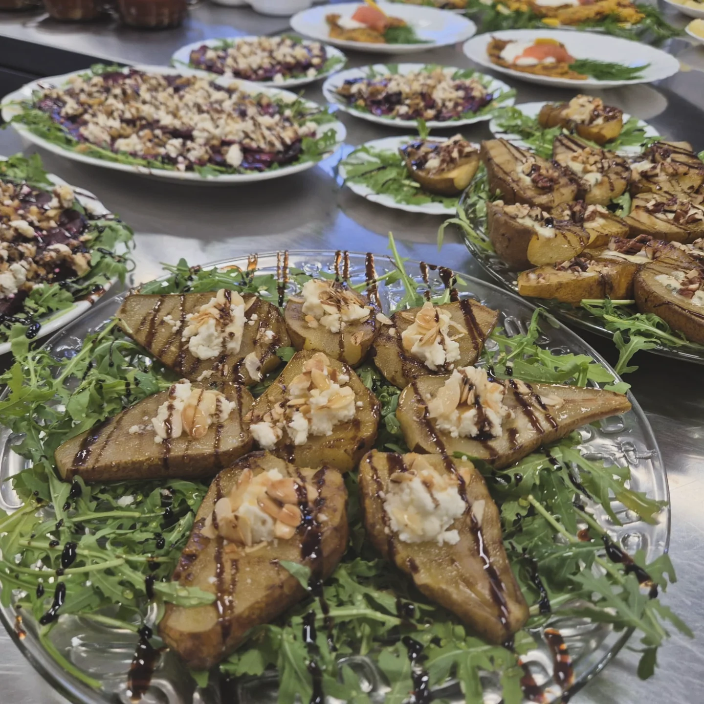 Gruszki karmelizowane z serem pleśniowym, wędzonymi płatkami migdałowymi i orzechami włoskimi lub pekan