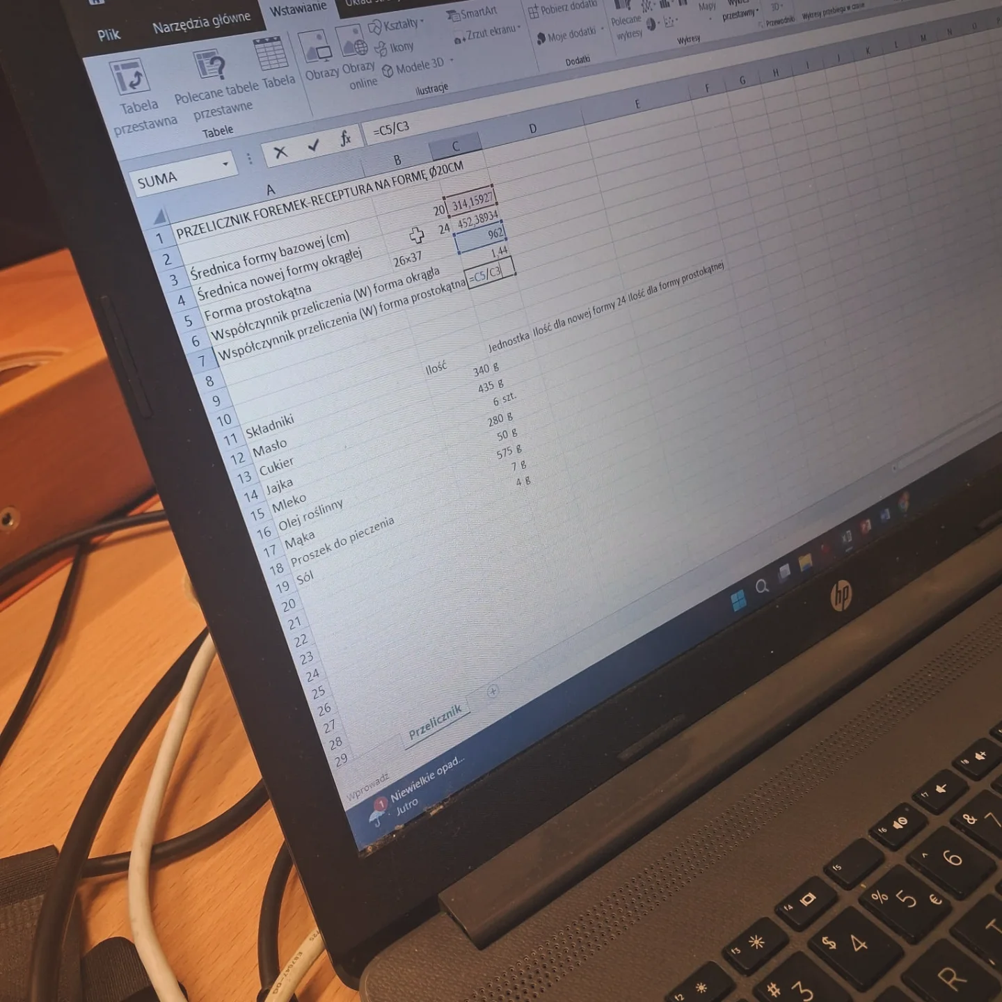 Istotnym elementem innowacji było rozwijanie kompetencji matematycznych w kontekście zawodowym. Uczniowie ćwiczyli zastosowanie obliczeń matematycznych przy przeliczaniu receptur, masy ciasta, objętości foremek oraz porcji wyrobów. Samodzielnie tworzyli arkusze kalkulacyjne w programie Excel, które umożliwiały przeliczanie receptur na różne wielkości form oraz optymalizację zużycia surowców. Działania te kształtowały logiczne myślenie, precyzję oraz umiejętność planowania procesu produkcyjnego.