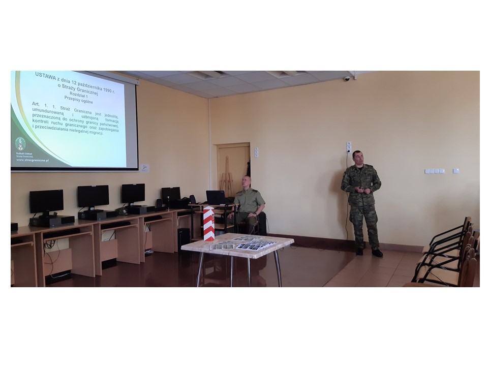 Celem spotkania, w którym udział wzięli uczniowie klas: V TEP, V TFP, V THP oraz III ZBP było przedstawienie zasad rekrutacji oraz warunków służby w Podlaskim Oddziale Straży Granicznej.