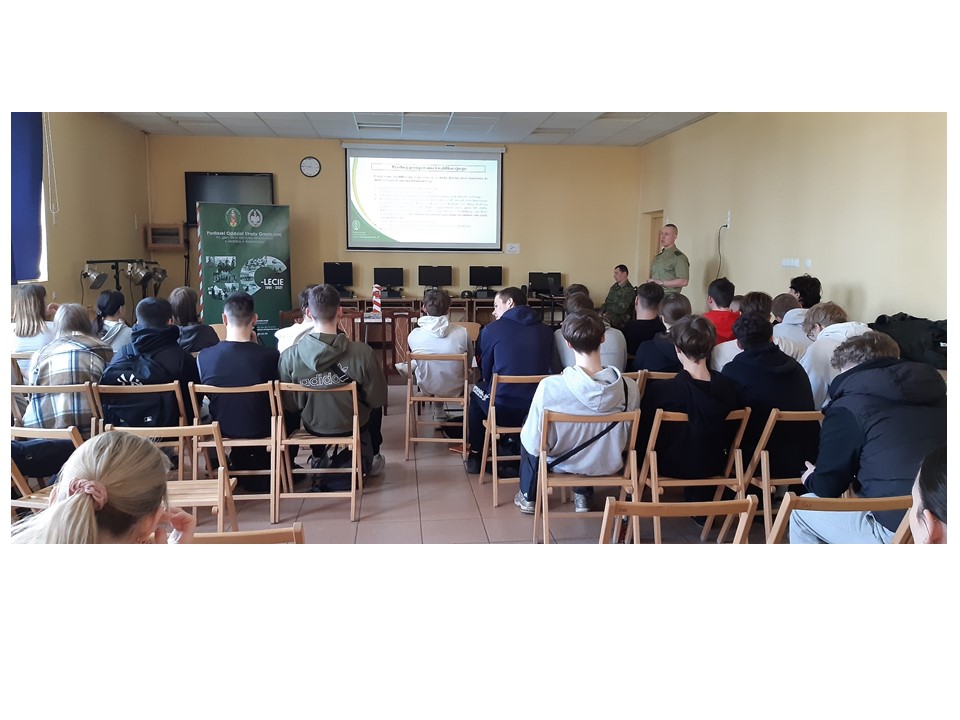 3 marca 2025 roku w progi Zespołu Szkół Gastronomicznych zawitali przedstawiciele Podlaskiego Oddziału Straży Granicznej w osobach st.chor.szt.SG Rafała Kazberuka oraz chor.SG Wojciecha Majchrzaka.