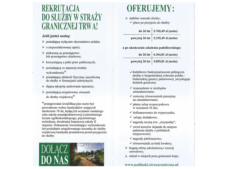 Najważniejsze z przedstawionych informacji znajdują się w zaprezentowanym niżej folderze. Można też odwiedzić stronę internetową Podlaskiego Oddziału SG: www.podlaski.strazgraniczna.pl