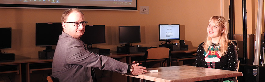 Pan Maciej Kułak zaprezentował jedną ze swoich książek :” 100-tka zdarzeń krótkofalowych, czyli lateralna ezoteryka paradoksu”. Uczniowie czytali wspólnie teksty, analizowali zawartą treść na poziomie metafizycznym oraz mieli ćwiczenia z dykcji. Najwięcej zadań rozwiązał Daniel Buczkowicz - serdecznie gratulujemy! Jednocześnie bardzo dziękujemy za udział ( i miłą atmosferę) całej klasie IV TGP i uczniom z Samorządu Uczniowskiego!